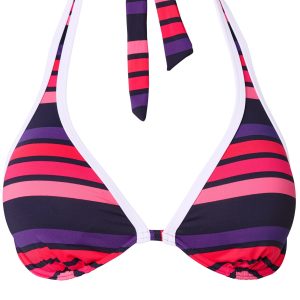 Enjoy the classic styling of a halter bikini top with a touch of sporty fun! The trendy stripe pattern makes the bright contrast trim stand out. Sash ties around the neck and back, plus the adjustable padding and cups, offer the perfect balance of support and coverage.